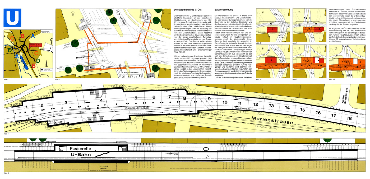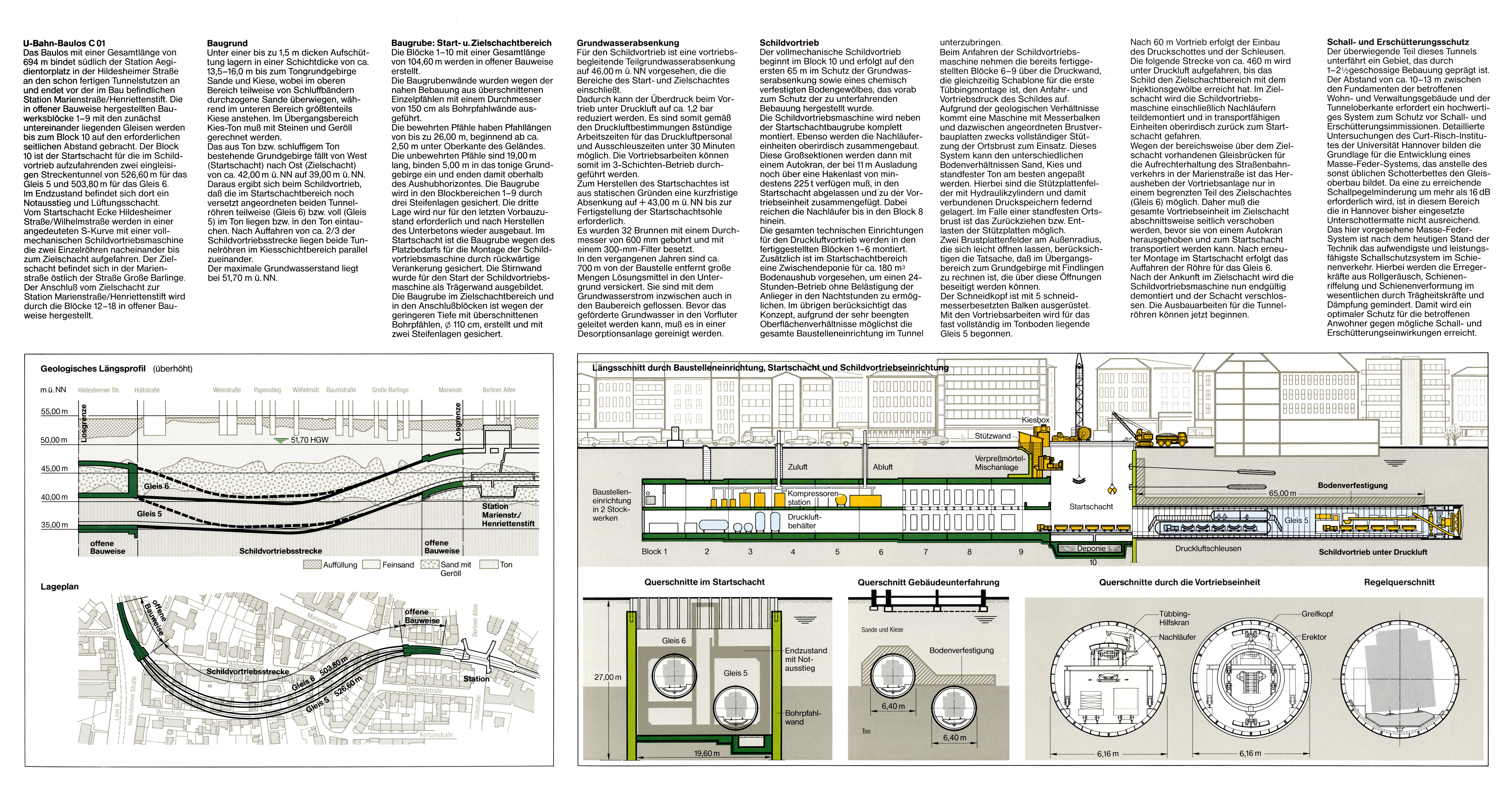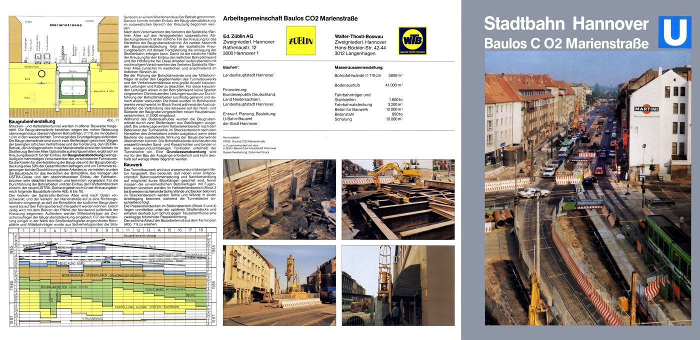 In dieser Infobroschüre aus dem Jahr 1986 wird das Baulos C 01 Schildvortrieb (Aegi Richtung Marienstraße) detailliert vorgestellt, inklusive detaillierten technischen Zeichnungen, Längsprofil und Querschnitte der Strecke.