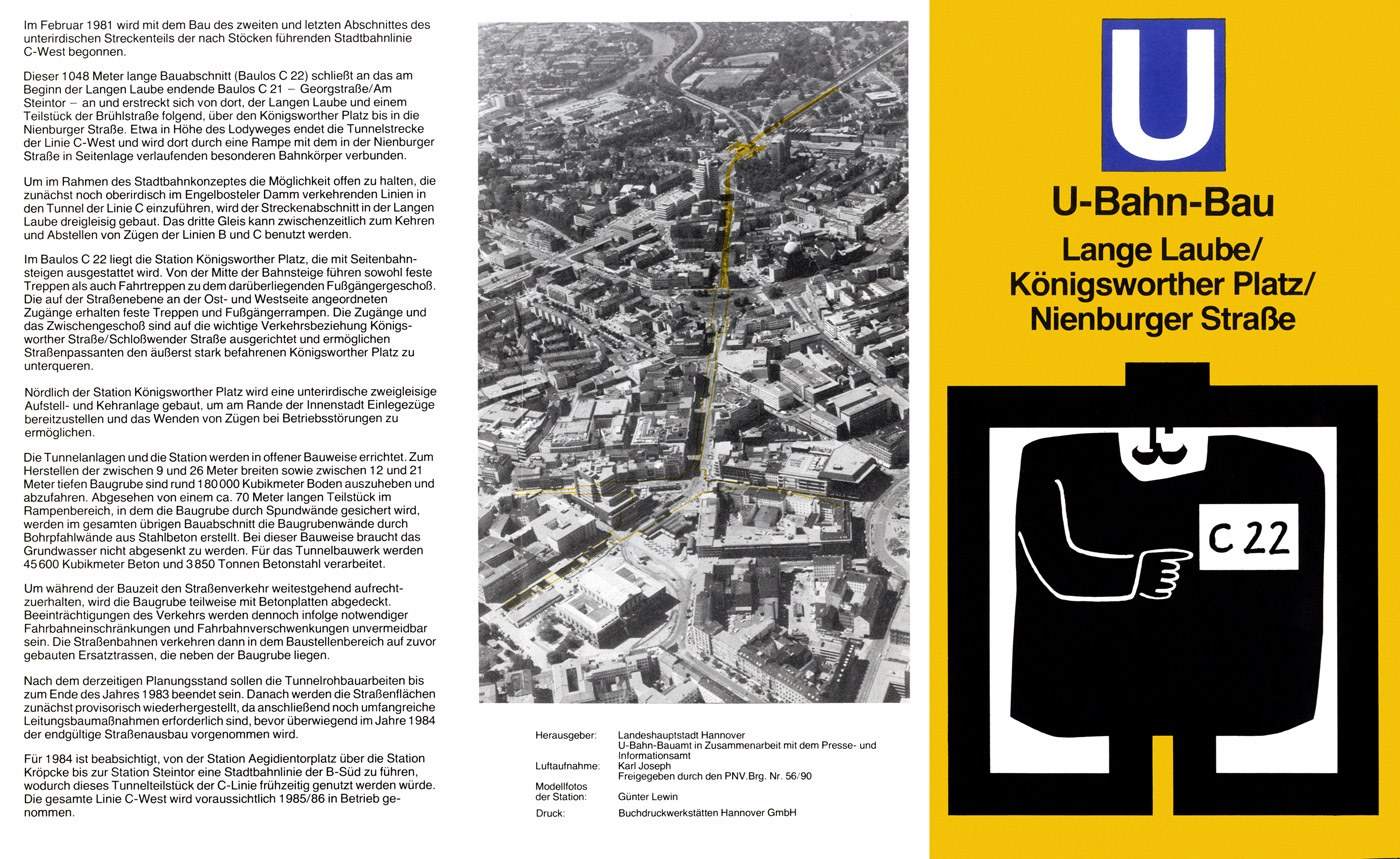 In dieser Infobroschüre aus dem Jahr 1983 wird das Baulos C 22 entlang der Langen Laube mit der Station Königsworther Platz detailliert vorgestellt, inklusive Bauzeitenplan und Einblicken in die Baustelle.
