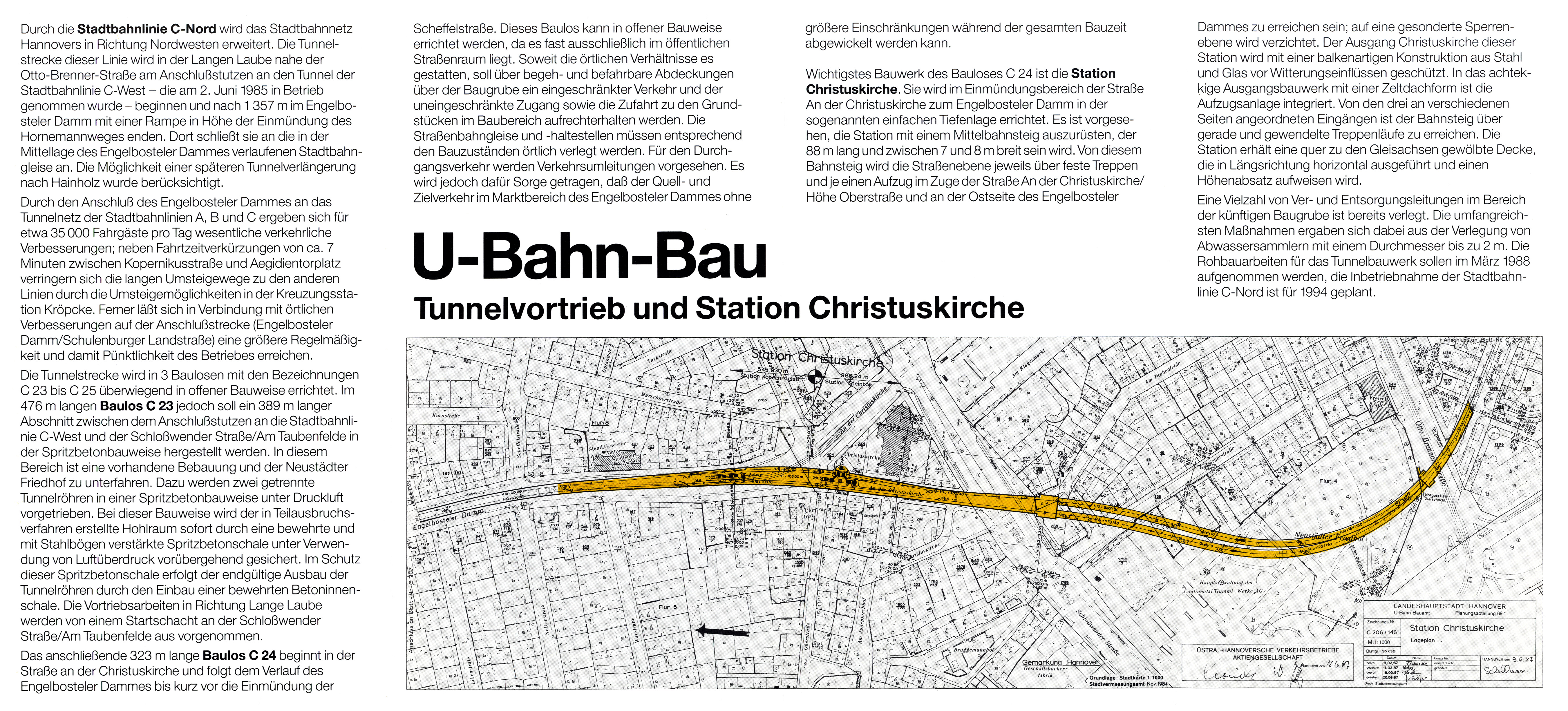 In dieser Infobroschüre mit Einklapper aus dem Jahr 1990 wird das Baulos C 25 Engelbosteler Damm und Station Christuskirche vorgestellt, inklusive einiger Baustellenfotos.
