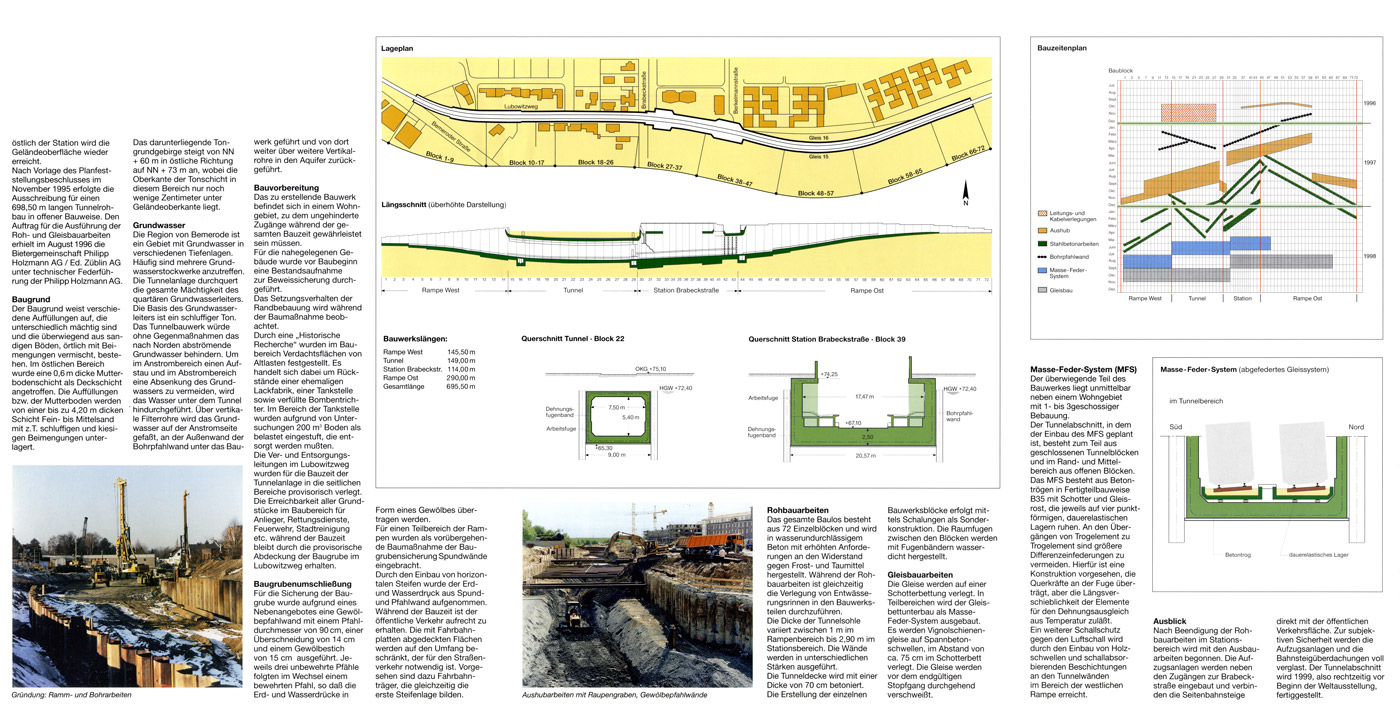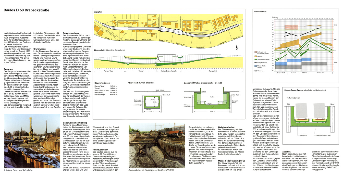 In dieser Infobroschüre, vermutlich aus dem Jahr 1998, wird der Baustellenfortschritt auf dem Baulos A 50 Brabeckstraße mit dem Tunnel Lubowitzweg und der Station Brabeckstraße gezeigt. Lagepläne, Schnitte und ein Bauzeitenplan runden die Info ab.
