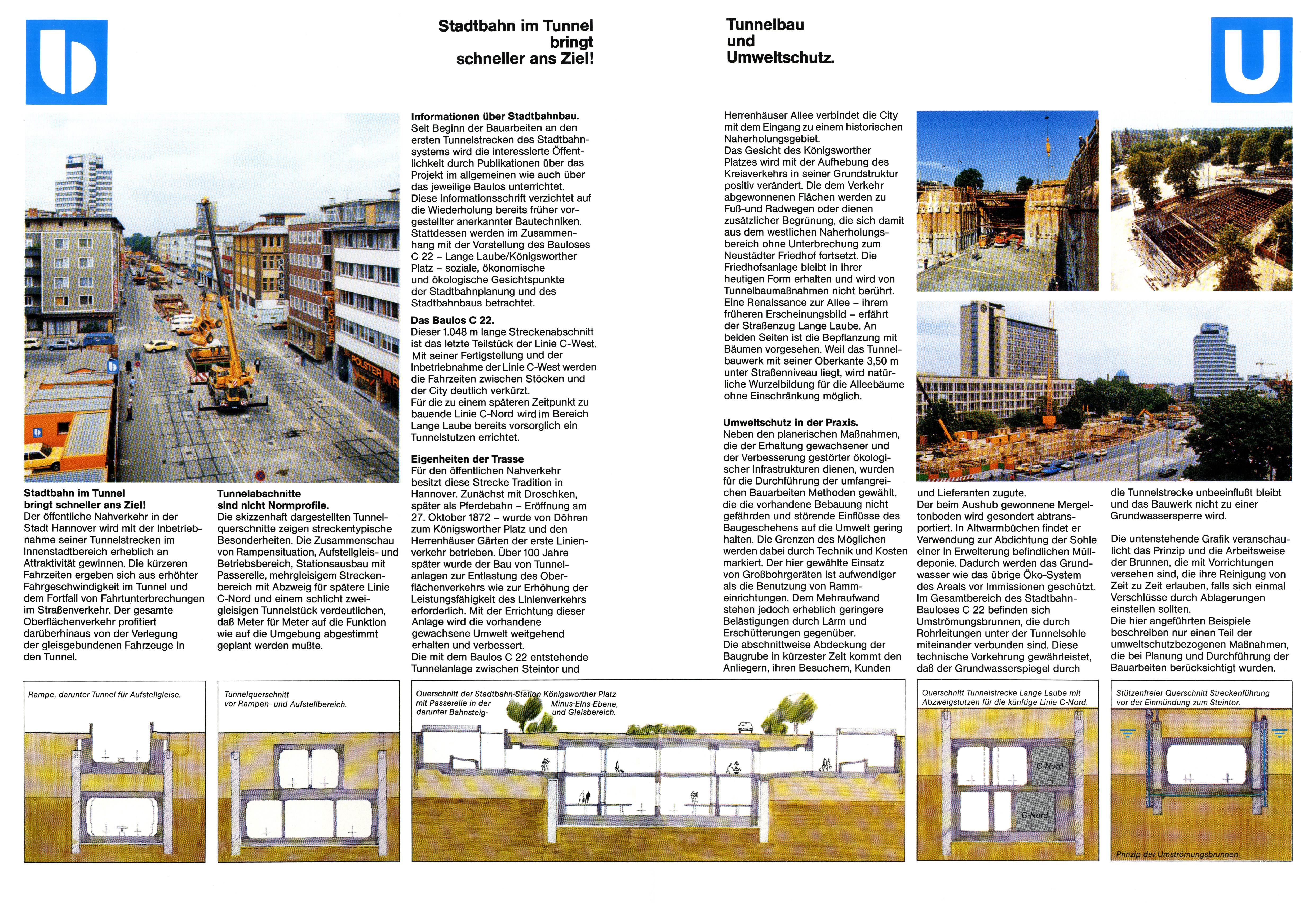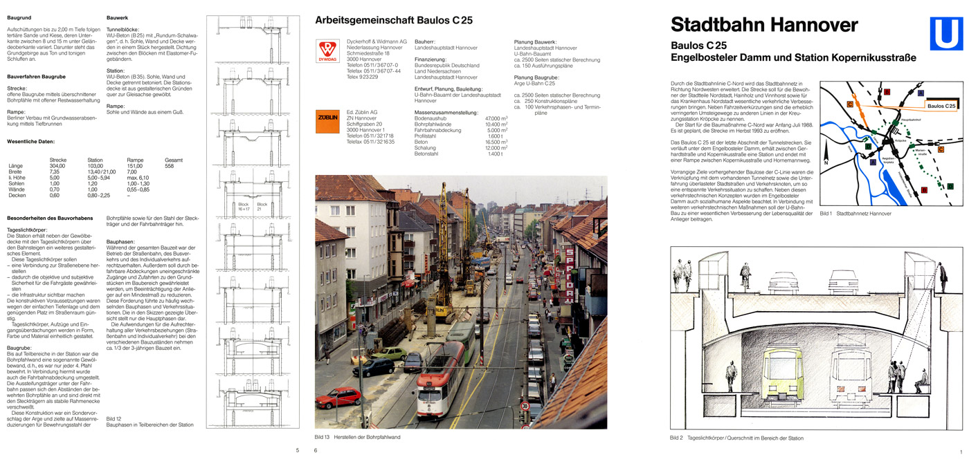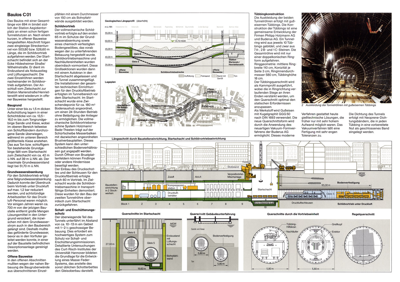 In dieser Infobroschüre aus dem Jahr 1986 wird das Baulos C 01 Schildvortrieb (Aegi Richtung Marienstraße) detailliert vorgestellt, inklusive detaillierten technischen Zeichnungen, Längsprofil und Querschnitte der Strecke.